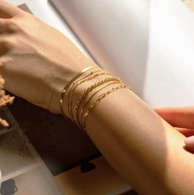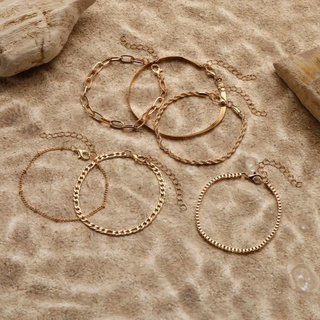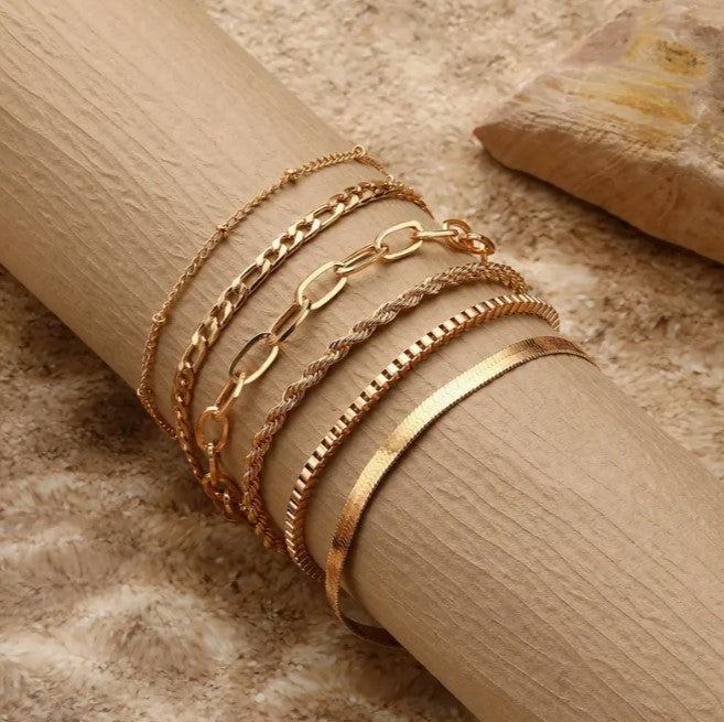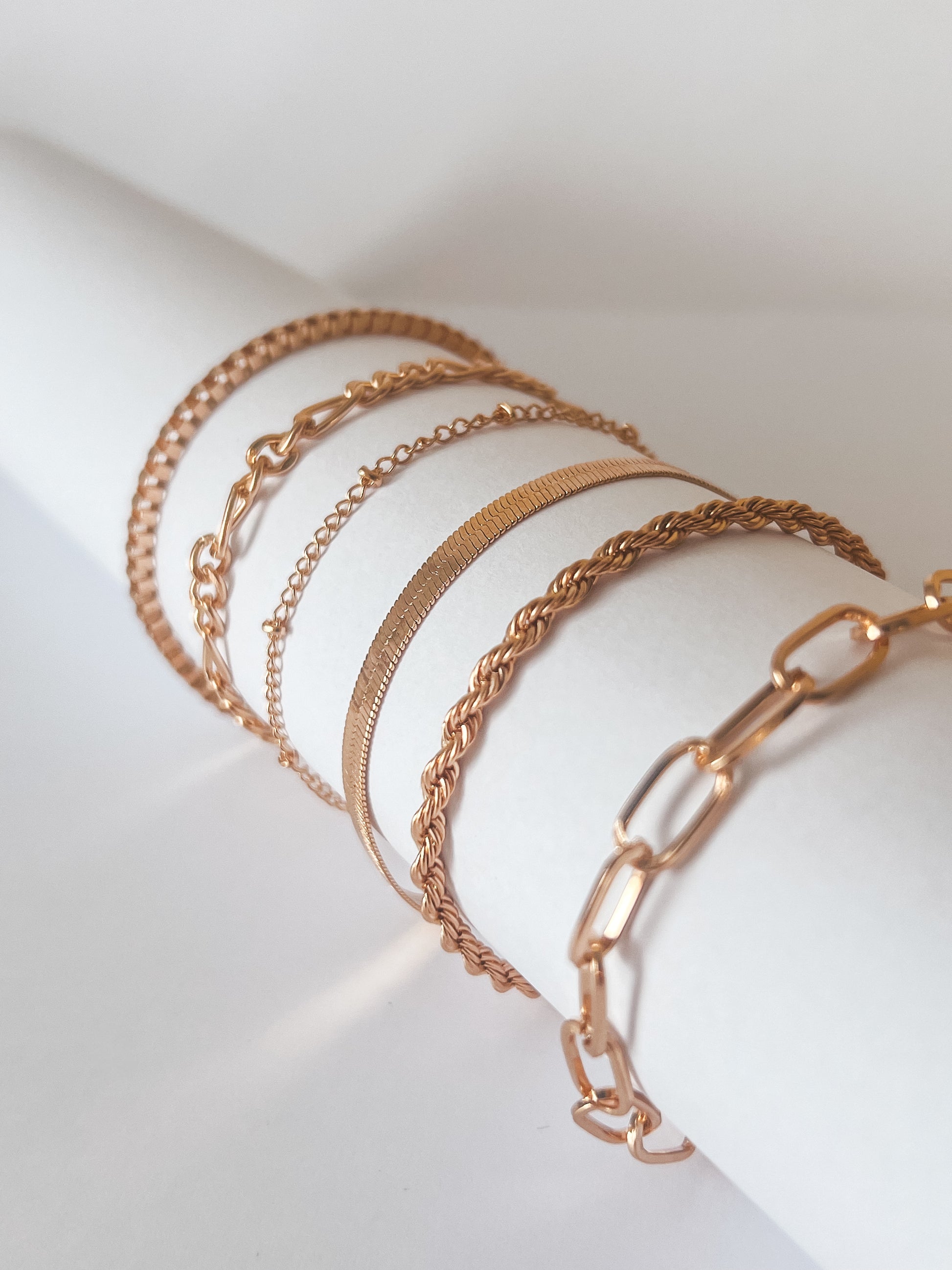 Penkių apyrankių rinkinys SATYA – tai elegantiškas ir madingas aksesuaras, puikiai papildantis tiek kasdienį, tiek šventinį įvaizdį. Apyrankės yra įvairaus dizaino, tačiau puikiai dera tarpusavyje dėl vieningos aukso spalvos. Visos apyrankės pagamintos iš nerūdijančio plieno, todėl jos yra atsparios dilimui, nealergizuojančios ir ilgai išlaiko savo spindesį.