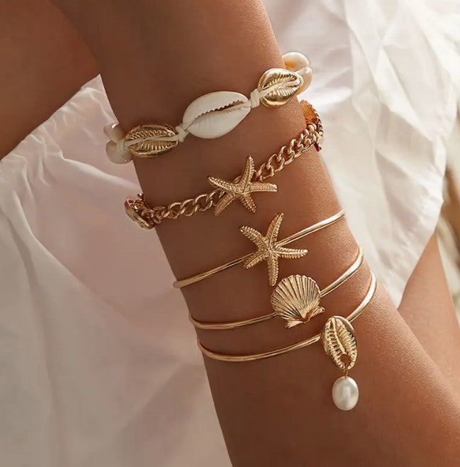 Šis papuošalų rinkinys „Seatime“ įkvėptas jūros motyvų ir yra puikus pasirinkimas vasaros sezonui ar tiems, kurie mėgsta jūrą bei paplūdimio estetiką. Rinkinį sudaro keli apyrankių sluoksniai, dekoruoti kriauklėmis, jūros žvaigždėmis, kriauklių motyvais bei perlais.