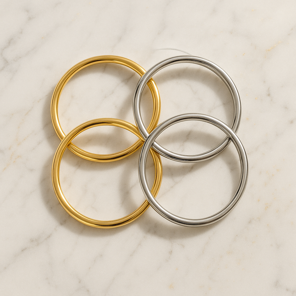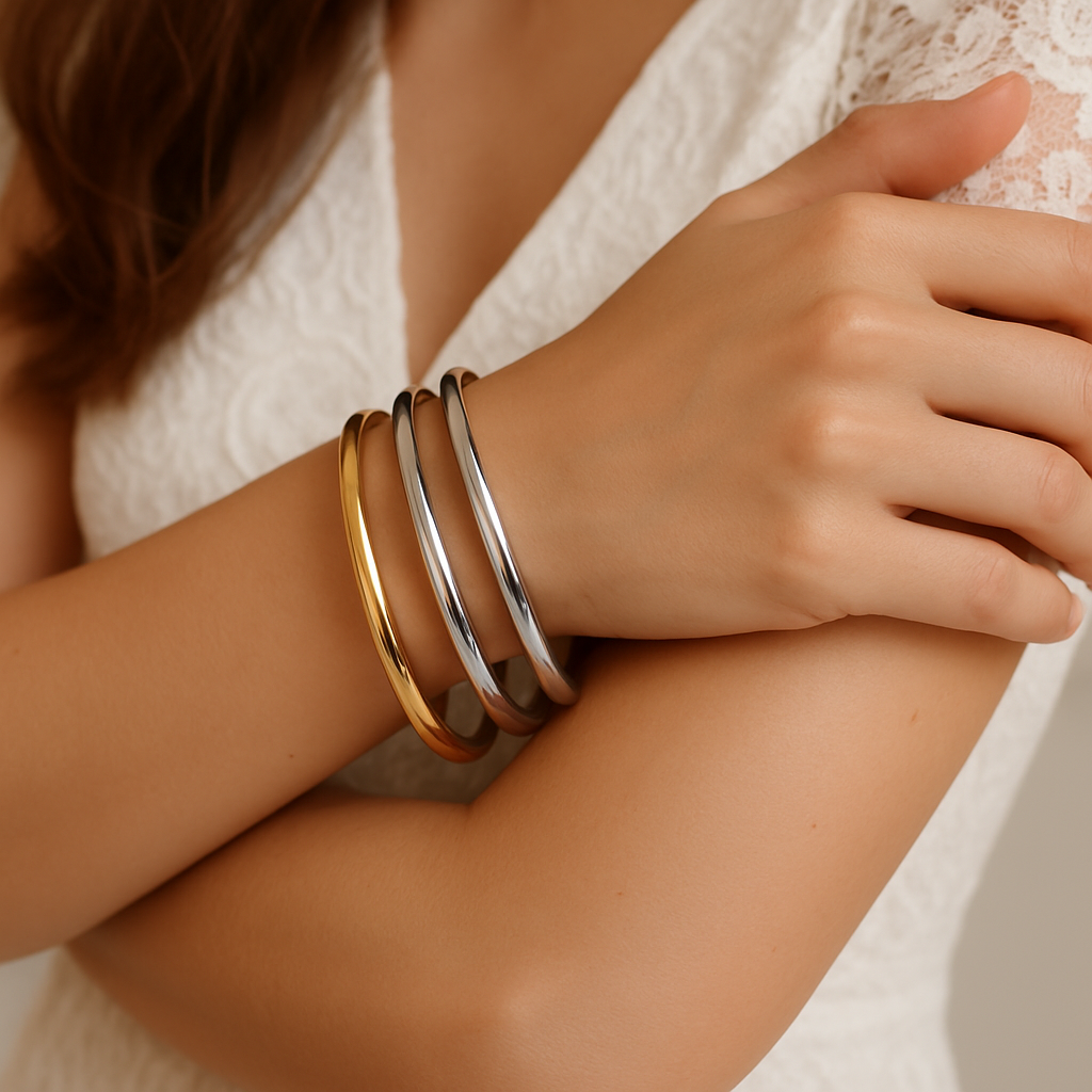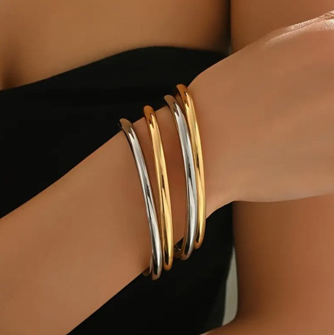 Atraskite laikui nepavaldžią eleganciją su šiuo išskirtiniu dvispalviu apyrankių rinkiniu, kuriame susilieja klasikinė auksinė ir moderni sidabrinė spalvos. Minimalistinis dizainas, tačiau maksimalus įspūdis – puikiai tiks tiek prie kasdienio, tiek vakarinio įvaizdžio.