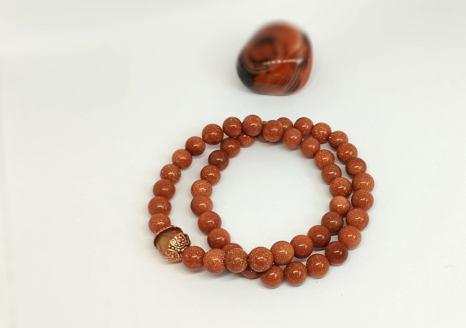 Šios elegantiškos apyrankės pagamintos iš sintetinės akmens medžiagos, vadinamos Auksinis Smėlis (Goldstone). Tai akmuo, garsėjantis savo ypatingu blizgesiu – it tūkstančiai mažų aukso dulkių būtų įstrigusios kiekviename karoliuke. Auksinio Smėlio akmuo suteikia papuošalui prabangos, šilumos ir subtilaus žaismingumo.