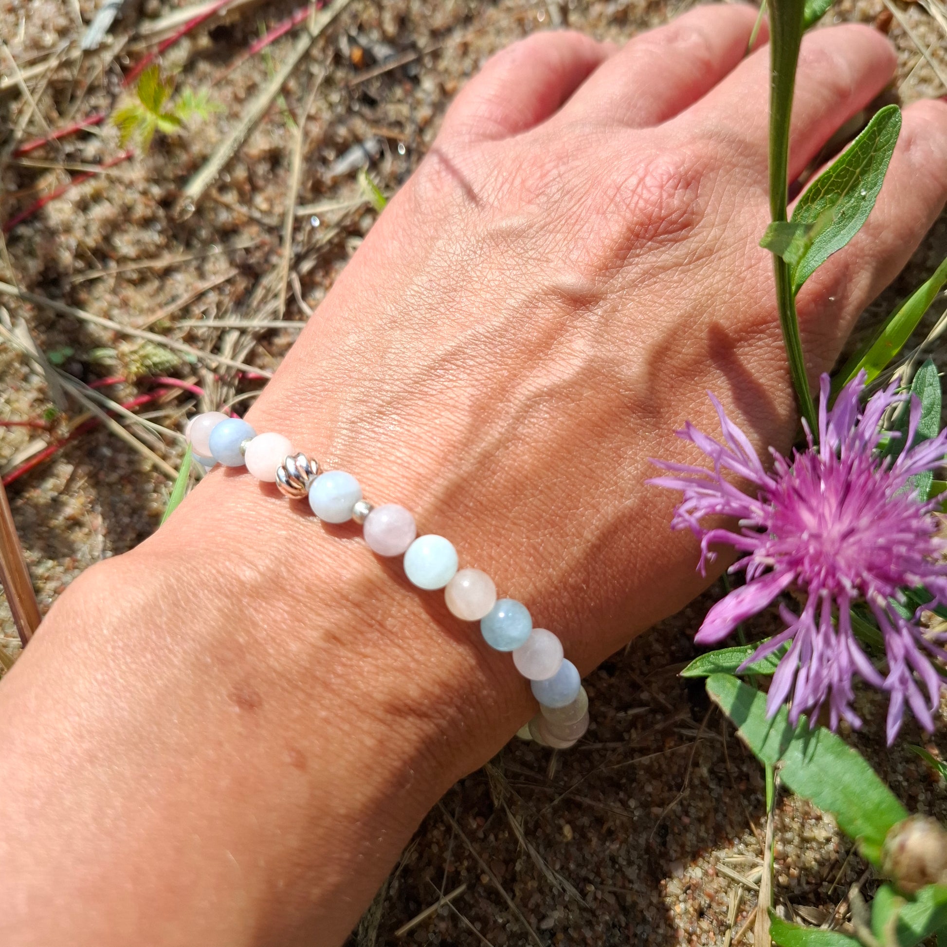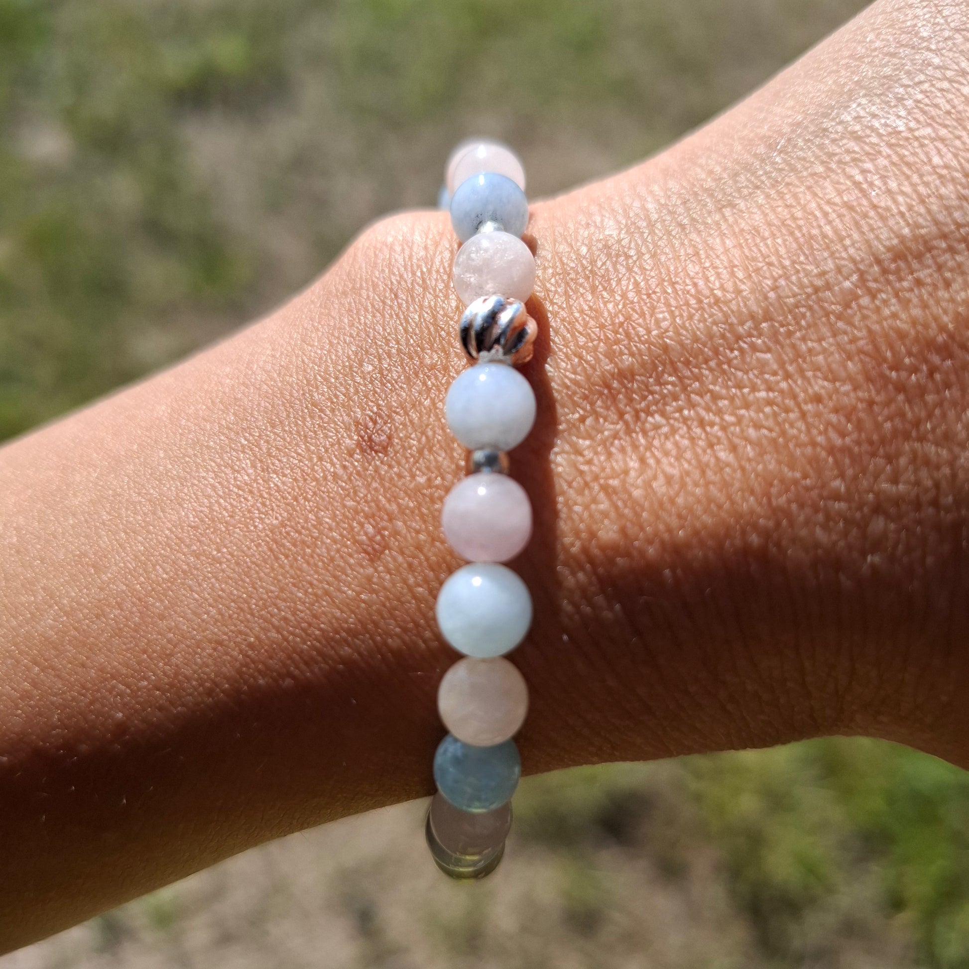 Apyrankė suverta iš 8 mm ar 6 mm natūralių berilo karoliukų, o jos akcentas – sidabro detalė, suteikianti papuošalui subtilios elegancijos. Auskarai – elegantiški, lengvi ir taip pat papuošti berilu bei subtiliomis sidabrinėmis detalėmis.