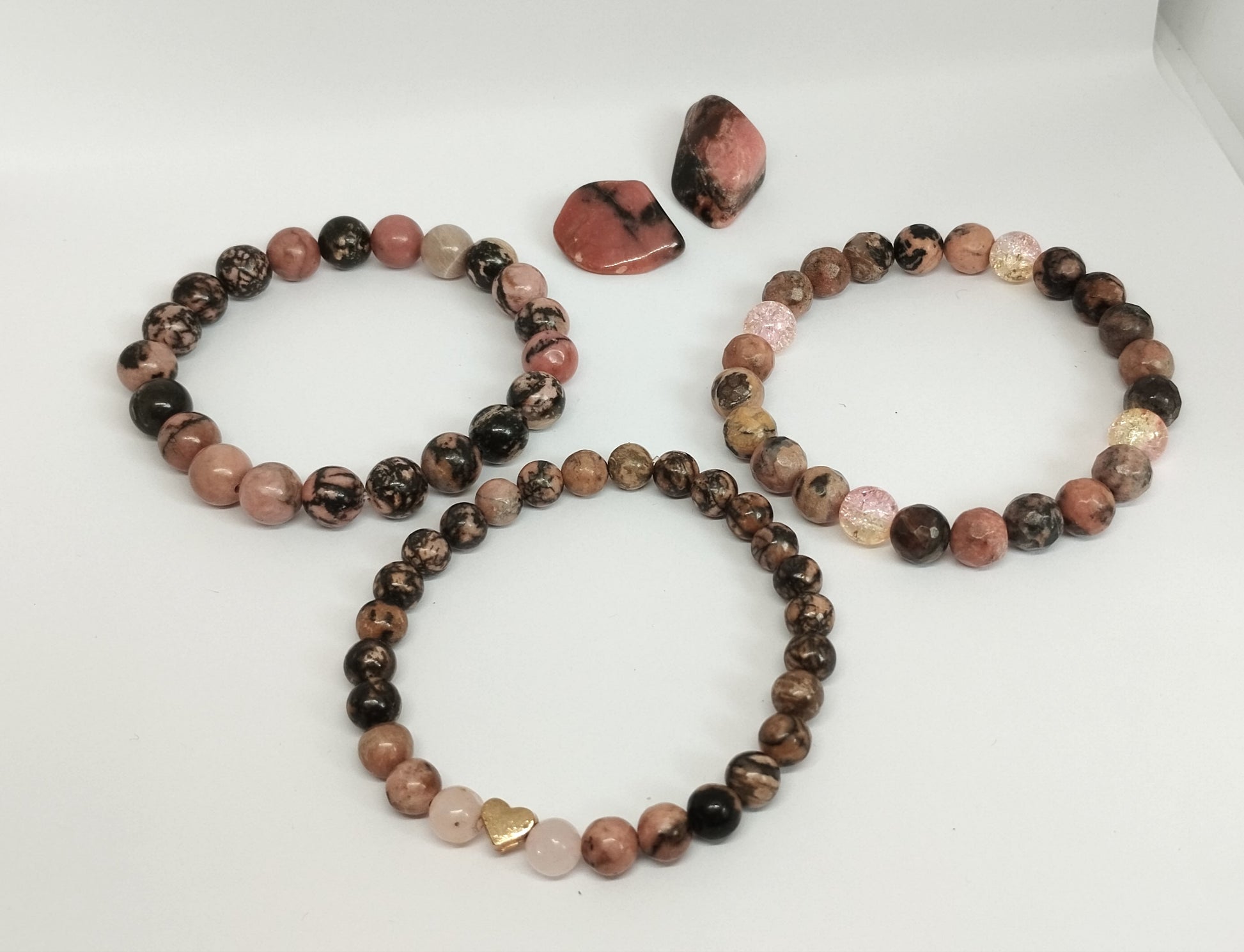 Rankų darbo rodonito akmens apyrankės – harmonija, ramybė ir natūralus moteriškumas.